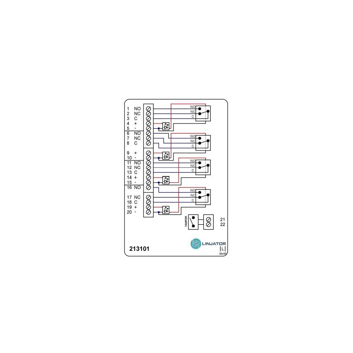Reläkort med fyra separata reläfunktioner, vardera med en växlande kontakt. Anslutning via skruvplint upp till 1 mm² med trådskydd av hisstyp. Reläerna styrs separat med 10–30 VDC (passar både 12 V och 24 V system). Försedd med sabotageskydd (brytande) på egen utgång.