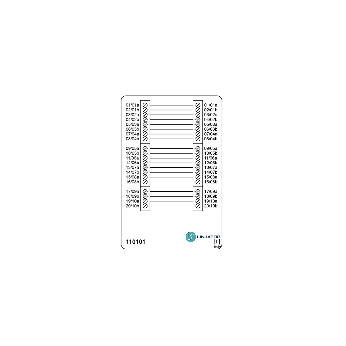 Kopplingsplint (även kallad teleplint) 20-pol till 20-pol med genomgående koppling. Anslutning via skruvplint upp till 1 mm² med trådskydd av hisstyp. Märkning 01–20 samt 01a–10b.
