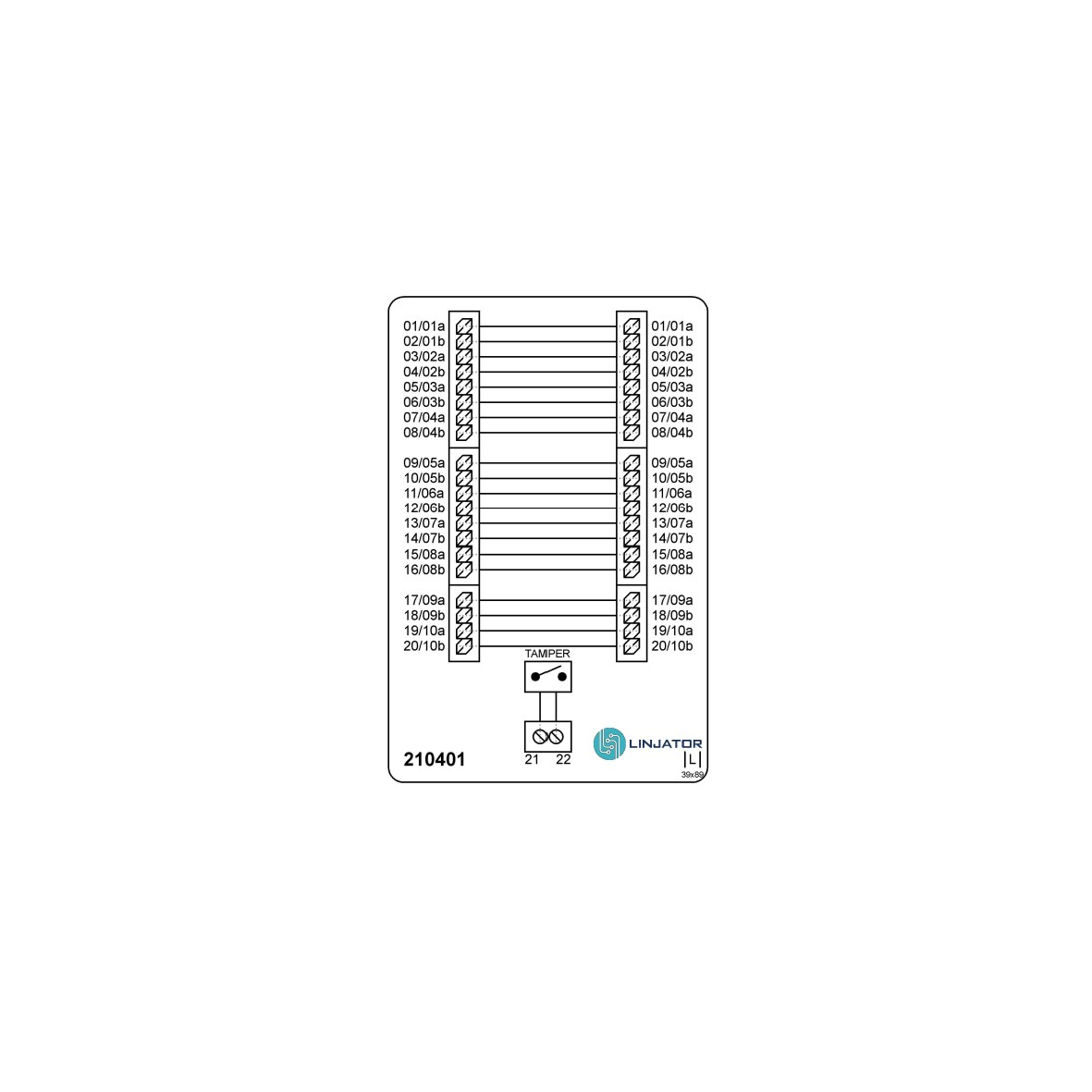 Anslutning sker via LSA/Slits-plint. Plinten är märkt 01–20 och försedd med sabotageskydd (brytande) på egen utgång.