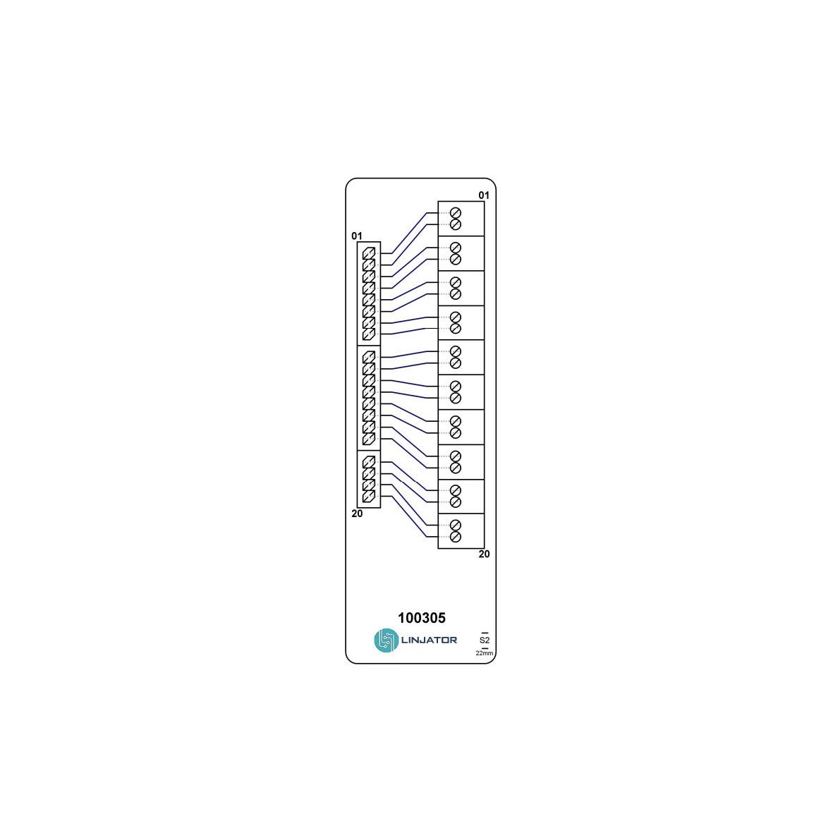 Kopplingsplint 20-pol till 20-pol med genomgående koppling. Anslutning via LSA/Slits-plint kabelarea 0,4–0,65 mm² vidare till skruvplint upp till 2,5 mm² med trådskydd av hisstyp. Märkning 01–20.